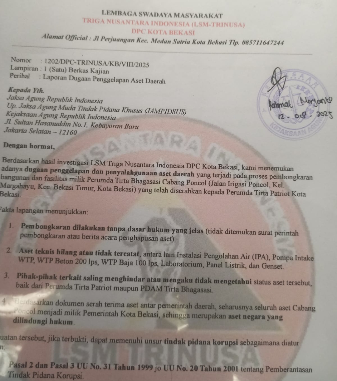 Surat dengan nomor 017/DPC-TRINUSA-BKS/VII/2025 tersebut merujuk pada temuan Laporan Hasil Pemeriksaan (LHP) BPK RI No. 2/LHP/XX/02/2024, yang mencatat bahwa sejak tahun 2017 hingga 2022, PDAM Tirta Bhagasasi tidak melunasi kewajiban pembayaran air baku, namun suplai tetap dilakukan oleh PJT II.